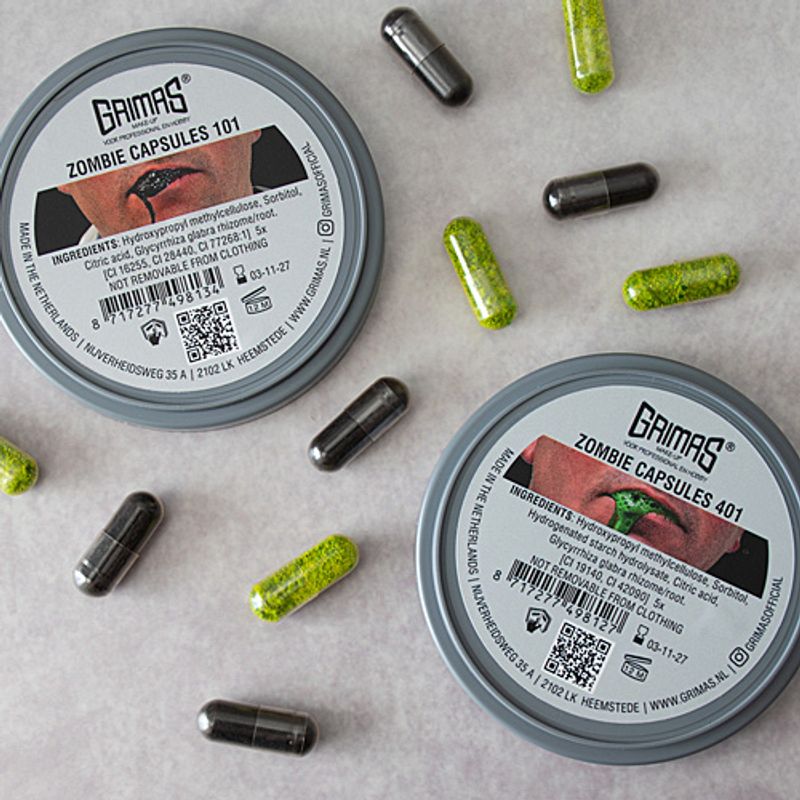 Grimas Zombie Capsules er kapsler av vegetabilsk opprinnelse fylt med et farget pulver som produserer en flytende substans når den blandes med spytt.